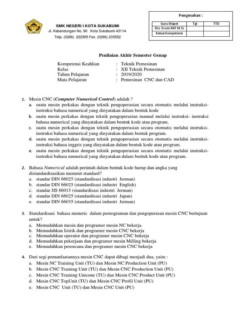 Soal Mesin Cnc Kelas 12 - Kumpulan Contoh Soal Cnc Dan Jawabannya Jawaban Dikdasmen : 6 pemeliharaan mesin sepeda motor kelas xii untuk smk/mak e.. Berilah tanda silang pada satu pilihan jawaban yang paling tepat pada lebar jawab. Situs ini berisikan tentang contoh rpp k13 revisi, latihan soal unbk, usbn, uas, uh, buku pelajaran/modul, tutorial mastercam, oprasional mesin cnc (gsk, fanuc, siemens, mach3) header ads rpp k13 revisi 10 contoh soal kelarutan dan hasil kali kelarutan beserta jawabannya. Xii (dua belas) pukul : Rpp gerinda kelas xi tp 2016 2017.